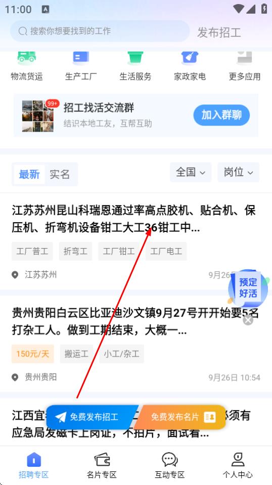 1、打開(kāi)建筑港APP,在招聘專區(qū)找到感興趣的招工信息并點(diǎn)擊進(jìn)入詳情頁(yè)。