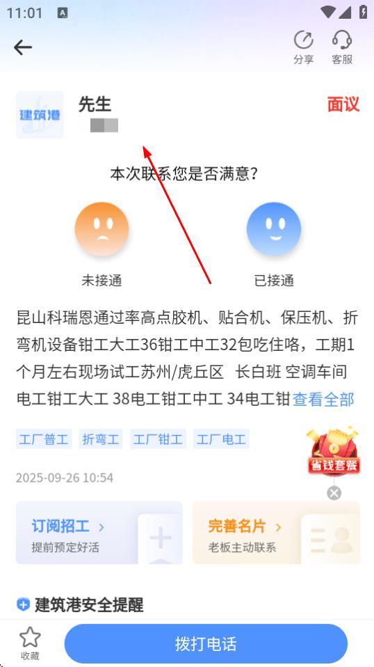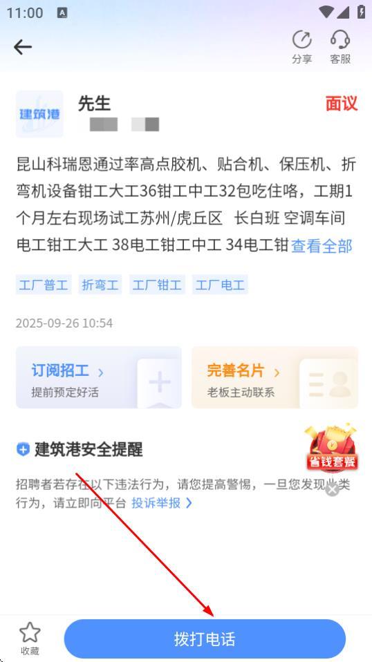 2、在招工信息詳情頁(yè),點(diǎn)擊撥打電話按鈕。
