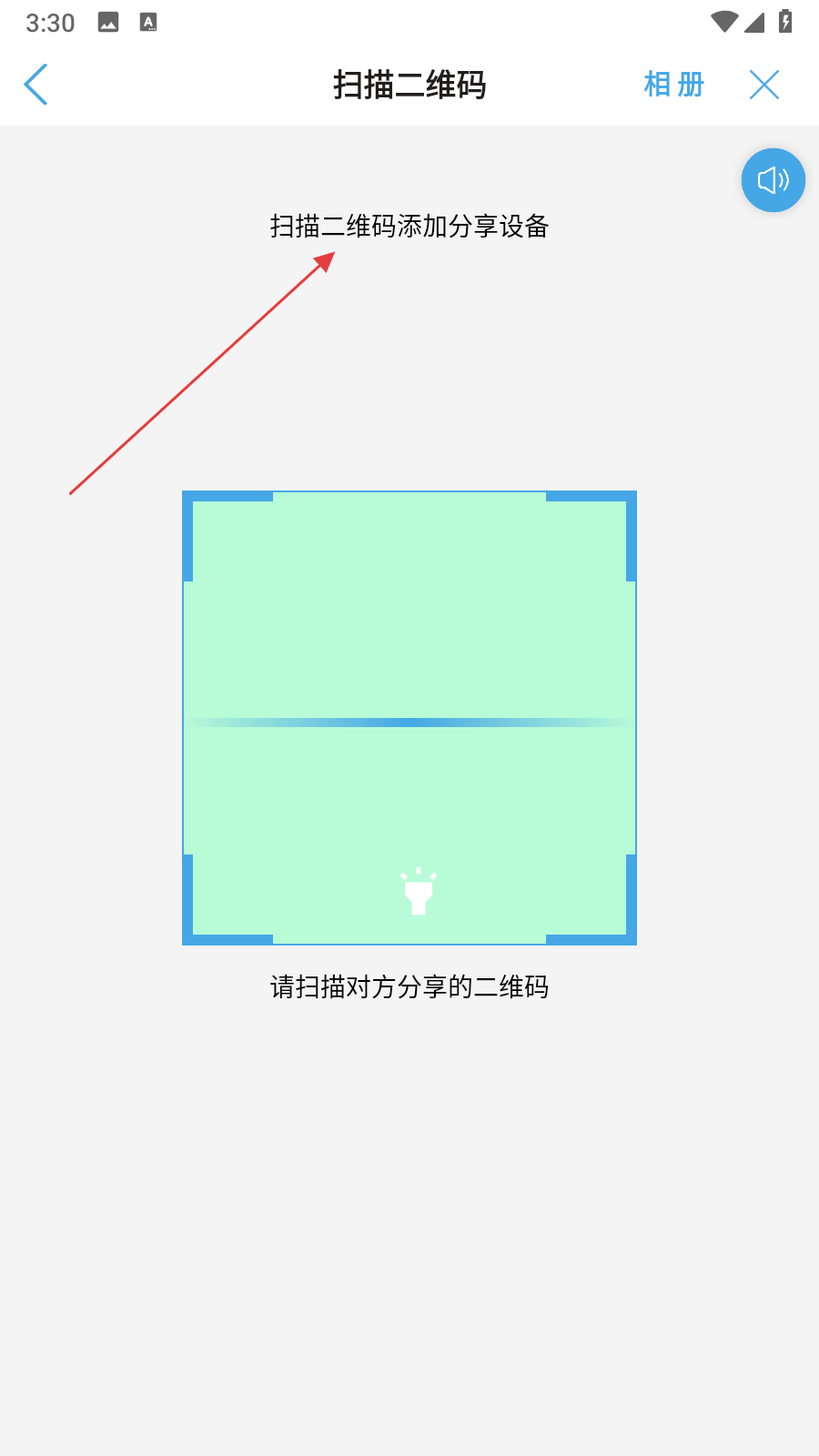 3、進(jìn)入掃描二維碼界面,將對方分享的設(shè)備二維碼對準(zhǔn)掃描框,等待應(yīng)用識別設(shè)備分享信息。