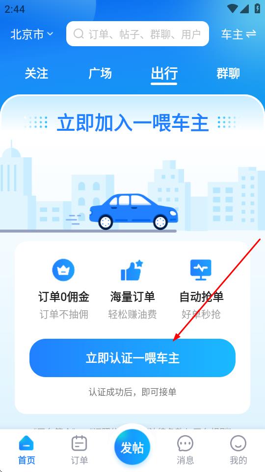 1、打開一喂順風(fēng)車App,在出行界面點擊立即認(rèn)證一喂車主。