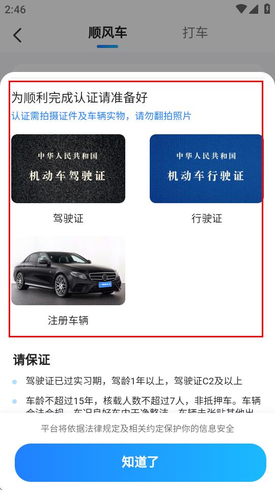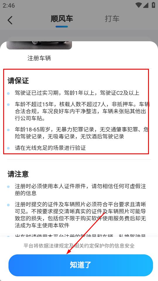 3、滿足年齡18-65周歲,駕駛證過實習(xí)期、駕齡1年以上且為C2及以上,無暴力犯罪、交通肇事犯罪等不良記錄,點擊知道了