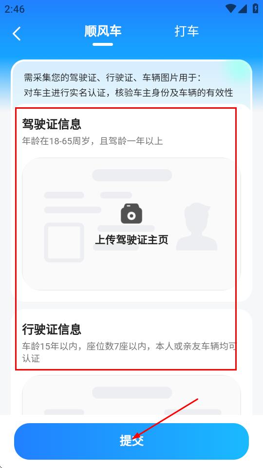 4、在信息采集頁面,按要求上傳駕駛證主頁以及行駛證信息,點擊提交,等待平臺審核通過即可成為車主。
