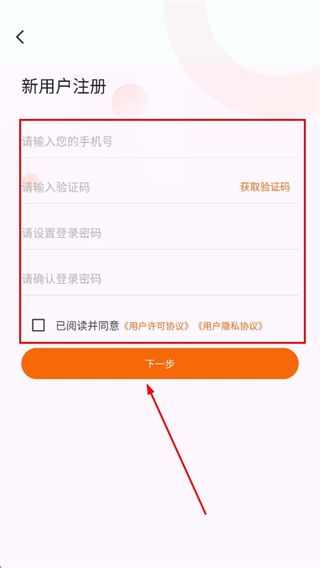 2、在新用戶注冊(cè)頁(yè)面,輸入手機(jī)號(hào)、驗(yàn)證碼,設(shè)置登錄密碼并確認(rèn),勾選協(xié)議,點(diǎn)擊下一步。