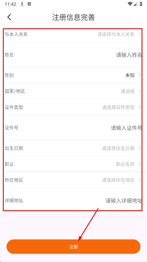 3、填寫與本人關(guān)系、姓名、性別、證件類型及號(hào)碼等信息,最后點(diǎn)擊注冊(cè)。