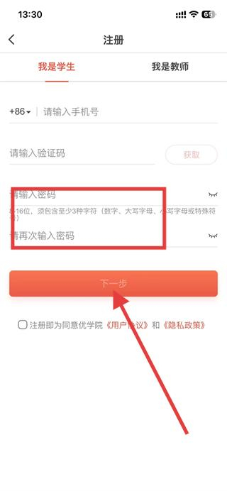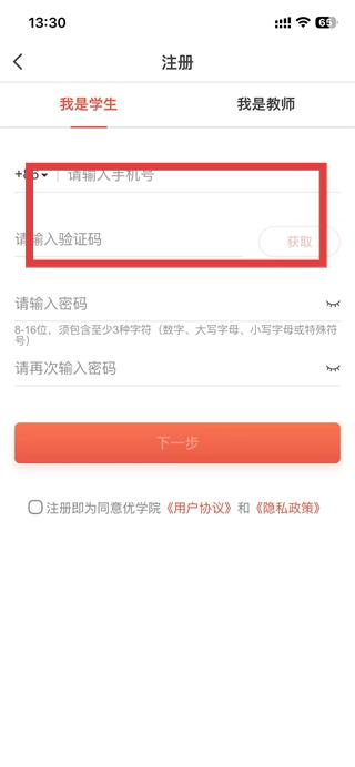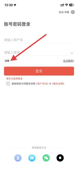 1、打開優(yōu)學(xué)院app,在賬號(hào)密碼登錄頁(yè)面,點(diǎn)擊注冊(cè)選項(xiàng)。