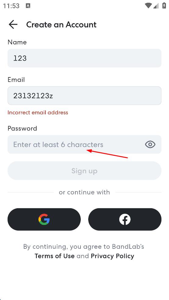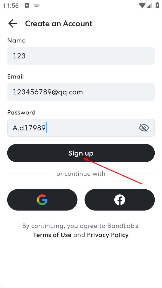 4、完成Name、Email、Password的正確填寫后,界面上“Sign up”按鈕變?yōu)榭牲c(diǎn)擊狀態(tài),點(diǎn)擊“Sign up”按鈕,即可完成BandLab賬號(hào)注冊(cè)。