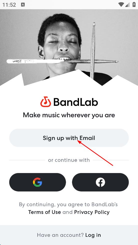 2、進(jìn)入BandLab主界面,界面顯示“Make music wherever you are”,有“Sign up with Email”以及通過Google、Facebook繼續(xù)的選項(xiàng),點(diǎn)擊“Sign up with Email”按鈕。