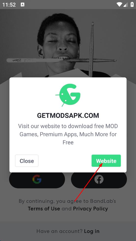 1、打開BandLab,出現(xiàn)GETMODSAPK.COM相關(guān)提示界面,界面有“Close”和“Website”按鈕,點(diǎn)擊“Close”按鈕關(guān)閉提示。