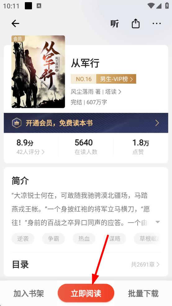 2、在搜索結(jié)果中找到目標(biāo)小說,查看小說評(píng)分、簡(jiǎn)介等信息,確認(rèn)后點(diǎn)擊立即閱讀按鈕。
