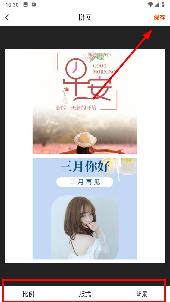 4、在拼圖編輯頁面,利用底部的比例、版式、背景等功能調(diào)整拼圖效果,完成后點擊右上角保存。