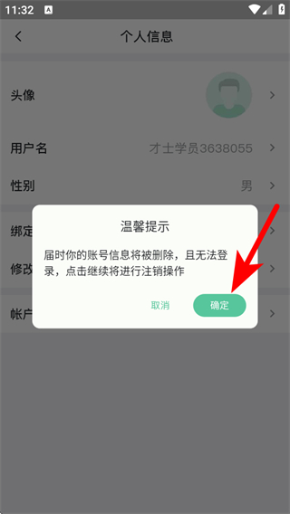 4、在系統(tǒng)溫馨提示框中,需要點(diǎn)擊確定,完成賬號(hào)注銷操作。