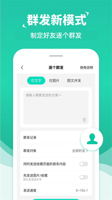 消息群發(fā)助手app是專門服務(wù)于微商群體的手機(jī)群發(fā)工具,具有群發(fā)圖片、群發(fā)文章、檢測(cè)粉絲、群內(nèi)添加好友等功能,還支持添加特色水印,圖文并茂更美觀,內(nèi)容切換更便捷,歡迎大家免費(fèi)下載!