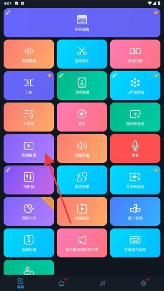 1、打開超級音樂編輯器APP,軟件會自動匯總手機內(nèi)所有音頻文件,點擊視頻編輯的功能圖標。