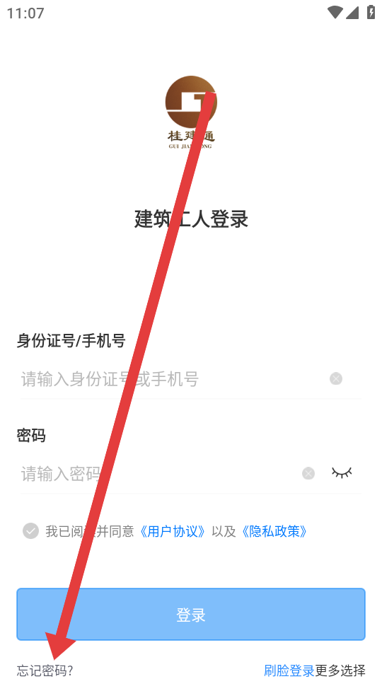 1、在建筑工人登錄頁面,如果忘記了密碼,需要點(diǎn)擊下方的忘記密碼,進(jìn)入密碼找回流程。