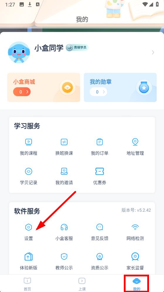1、打開小盒課堂app點擊底部導航欄中的我的選項,在軟件服務(wù)板塊點擊設(shè)置選項進入設(shè)置界面。
