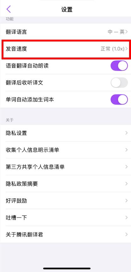 2、在設(shè)置頁面中找到發(fā)音速度選項并點(diǎn)擊進(jìn)入。