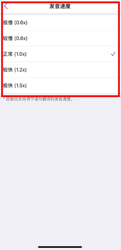 3、在發(fā)音速度設(shè)置頁面,根據(jù)需求選擇極慢0.6x,較慢0.8x,正常1.0x,較快1.2x,極快1.5x。