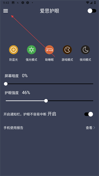 1、打開愛思護眼應(yīng)用,點擊界面左上角三條橫線樣式的菜單圖標(biāo),進入設(shè)置頁面。