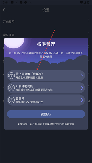 3、彈出權(quán)限管理窗口,在該窗口中找到最上層顯示(懸浮窗)選項。