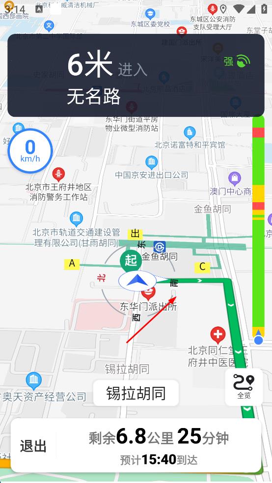 4、點(diǎn)擊“路線”后,軟件會(huì)規(guī)劃出從當(dāng)前位置到該地點(diǎn)的出行路線,同時(shí)顯示剩余距離、預(yù)計(jì)到達(dá)時(shí)間等信息,按照規(guī)劃路線出行即可。