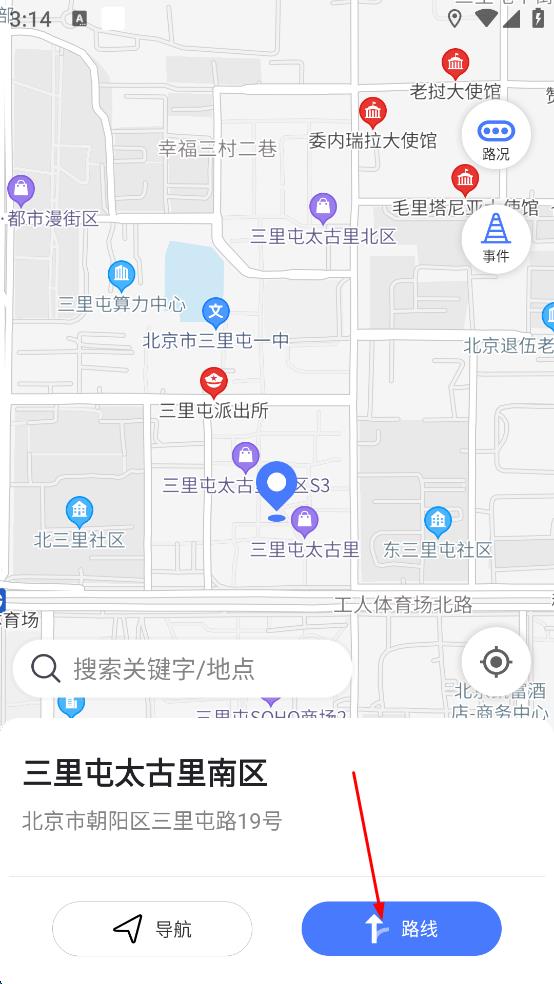 3、輸入地點(diǎn)后,在搜索結(jié)果中找到對(duì)應(yīng)的地點(diǎn),點(diǎn)擊該地點(diǎn),進(jìn)入地點(diǎn)詳情頁面,然后點(diǎn)擊“路線”按鈕。