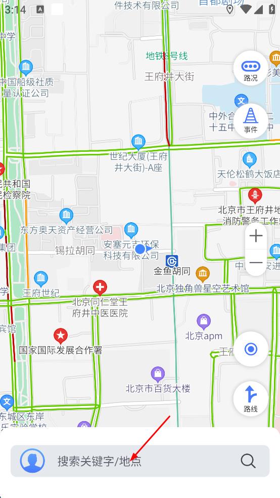 2、在軟件主界面,點(diǎn)擊底部的“搜索關(guān)鍵字/地點(diǎn)”輸入框,輸入要前往的地點(diǎn)。