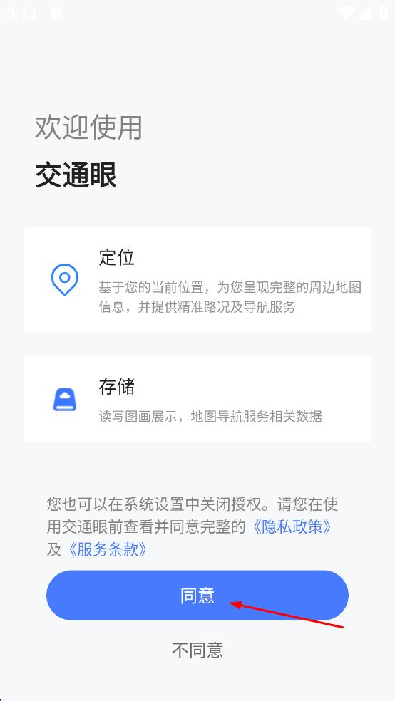 1、打開交通眼軟件,彈出權(quán)限說明頁面,點(diǎn)擊“同意”按鈕,進(jìn)入軟件主界面。