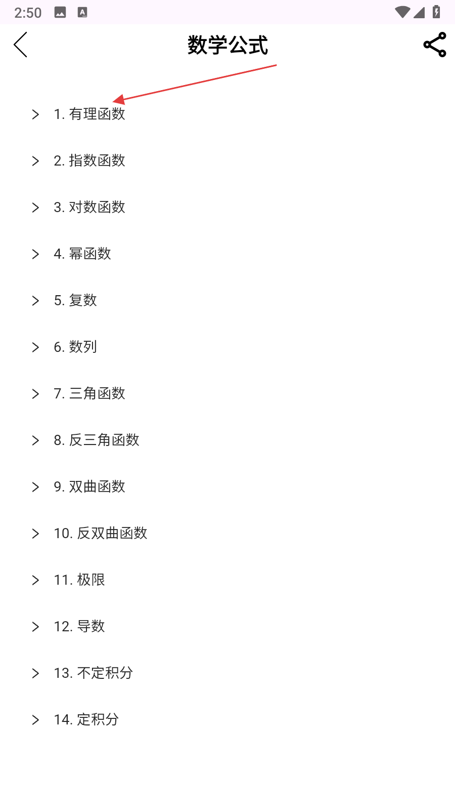 3、該頁面羅列了有理函數(shù)、指數(shù)函數(shù)、對數(shù)函數(shù)等多種數(shù)學(xué)公式分類,根據(jù)學(xué)習(xí)或計算需求,點擊對應(yīng)公式分類,查看該分類下的具體公式內(nèi)容。
