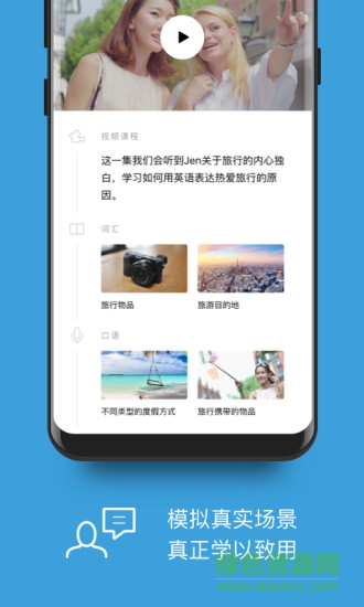 每節(jié)課都包含了實(shí)用的“小型”互動練習(xí)。使用者可以與視頻或音頻中的模擬人物一同練習(xí)英語,系統(tǒng)通過自動語音識別技術(shù)(ASR)了解你的語言習(xí)慣,為你的口語打分。
