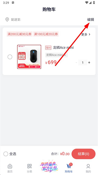 2、在購(gòu)物車頁(yè)面,點(diǎn)擊右上角編輯按鈕。