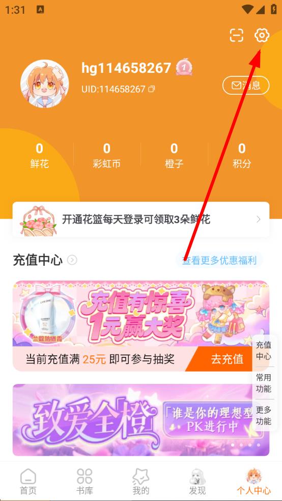 1、進(jìn)入個人中心頁面,點(diǎn)擊右上角齒輪狀的設(shè)置圖標(biāo),進(jìn)入設(shè)置界面。