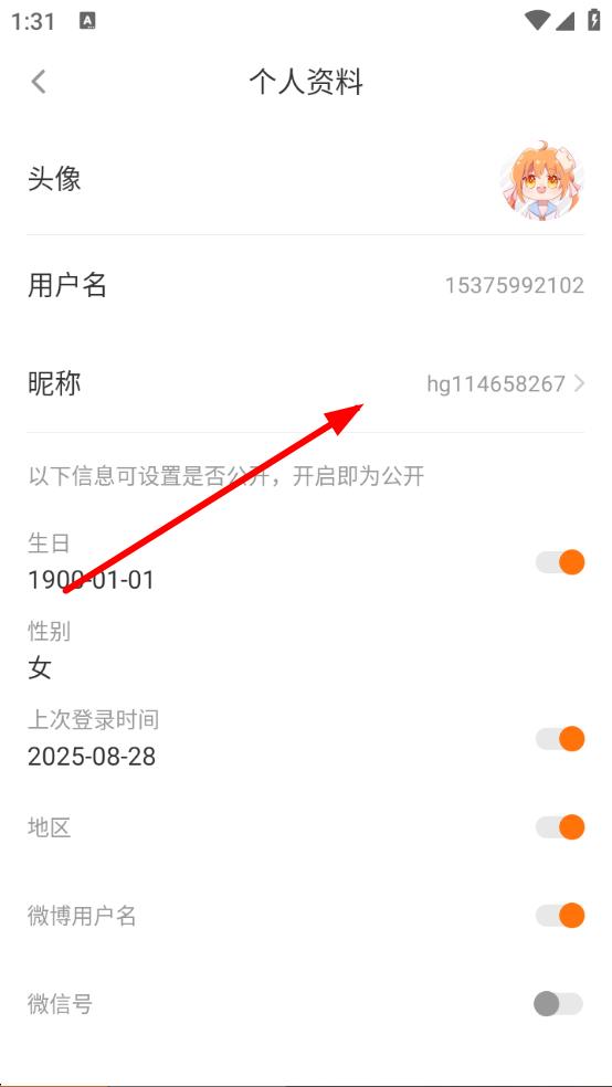 3、在個人資料頁面里,點(diǎn)擊昵稱右側(cè)箭頭,即可修改昵稱信息。