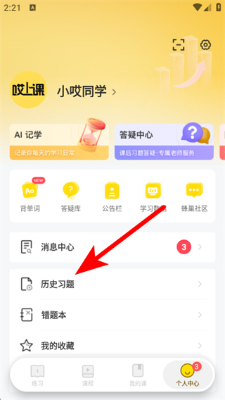 2、在個人中心的頁面,需要點(diǎn)擊歷史習(xí)題,進(jìn)入歷史練習(xí)頁面。