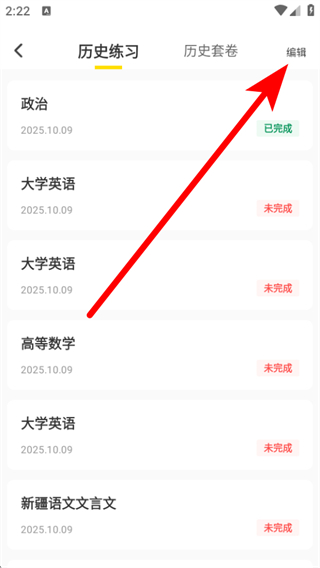 3、在歷史練習(xí)頁面,點(diǎn)擊編輯的按鈕,進(jìn)入編輯選擇的頁面。