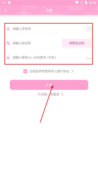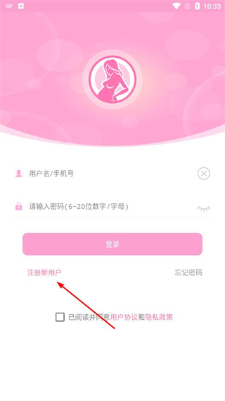 1、打開(kāi)幸孕兒APP,在登錄頁(yè)面點(diǎn)擊注冊(cè)新用戶選項(xiàng)。