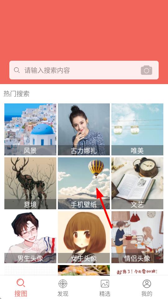 1、打開圖片大全搜圖神器app,在首頁的熱門搜索區(qū)域,點擊手機壁紙選項,進入手機壁紙搜索結(jié)果頁面。