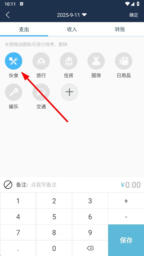 2、在記賬界面頂部,選擇記賬類型,包括支出、收入、轉(zhuǎn)賬。