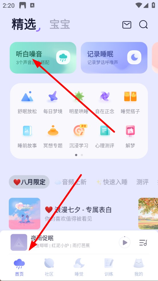 1、打開小睡眠APP,在首頁上方,找到并點擊聽白噪音按鈕。