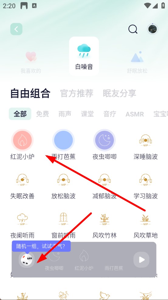 2、進入白噪音頁面后 ,可自由組合分類下白噪音選項,也可以點擊下方骰子圖標,隨機生成。