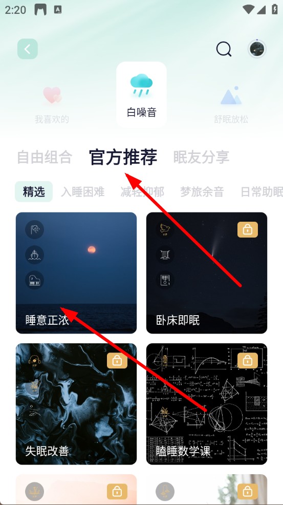 3、點擊頁面上方的官方推薦標簽,這里有官方搭配好的白噪音組合,例如睡意正濃等。