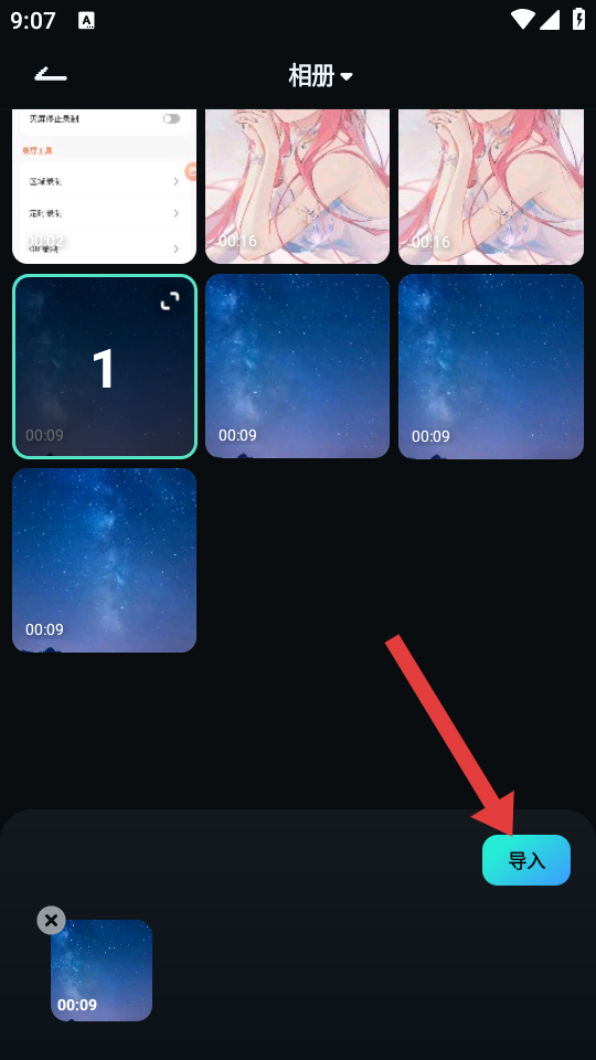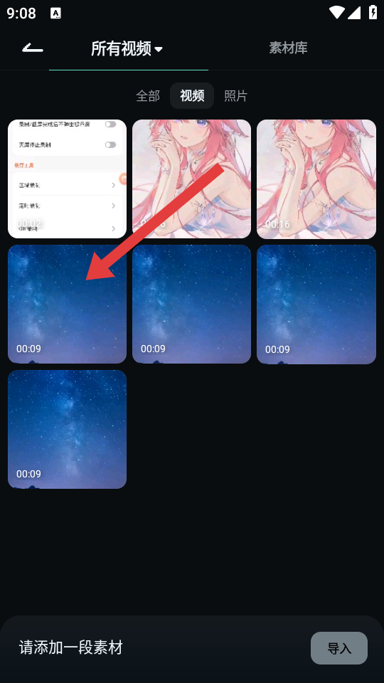 2、在素材選擇界面所有視頻或相冊板塊,選取要添加字幕的視頻素材。