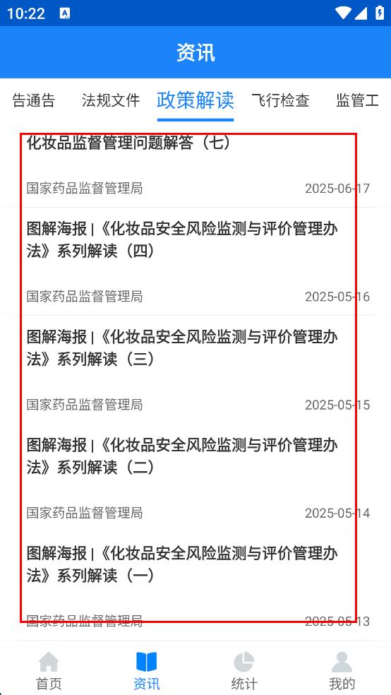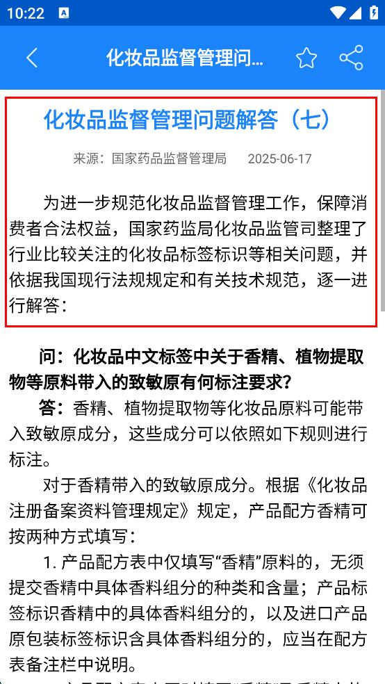 4、在資訊頁面,選擇“政策解讀”分類,然后點(diǎn)擊想要查看的資訊文章,如化妝品監(jiān)督管理問題解答,進(jìn)入文章詳情頁查看內(nèi)容。