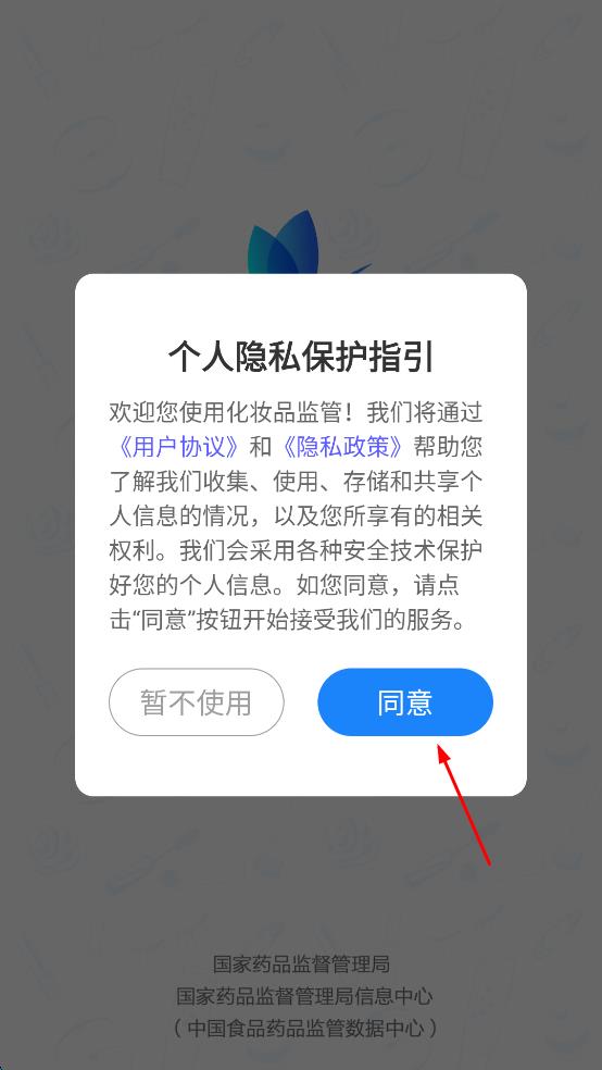 1、打開化妝品監(jiān)管軟件,出現(xiàn)個(gè)人隱私保護(hù)指引彈窗,點(diǎn)擊“同意”按鈕,進(jìn)入軟件。