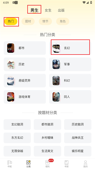 2、可以按照自己的喜好來進(jìn)行小說的篩選,例如通過依次點(diǎn)擊【男生-熱門-玄幻】來進(jìn)行篩選;
