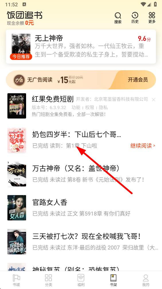 1、打開飯團(tuán)追書APP,在書架頁面選擇一本要閱讀的小說,點(diǎn)擊進(jìn)入閱讀界面。