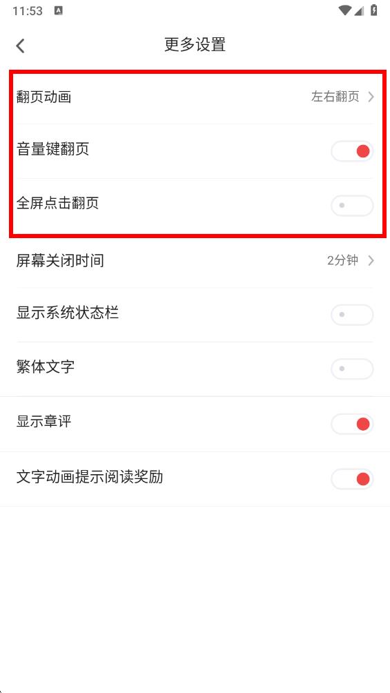 4、在更多設(shè)置界面里,找到翻頁動畫選項(xiàng)可選擇喜歡的翻頁效果,還能通過音量鍵翻頁和全屏點(diǎn)擊翻頁的開關(guān)按鈕,開啟或關(guān)閉對應(yīng)翻頁方式。