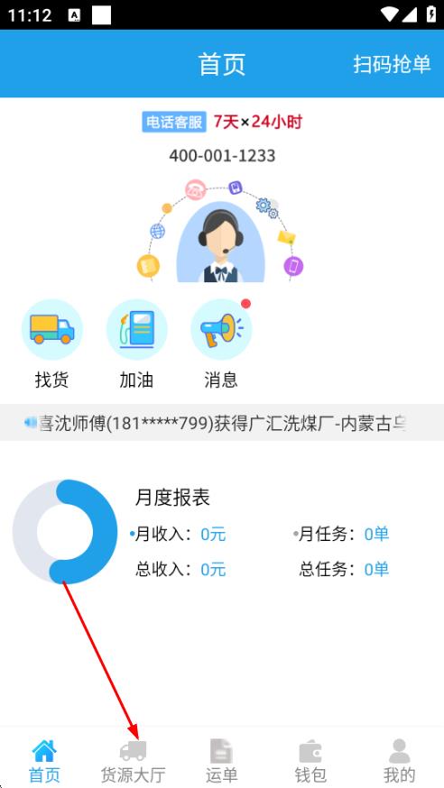 1、打開運(yùn)鋼好司機(jī)APP,進(jìn)入首頁(yè),點(diǎn)擊底部導(dǎo)航欄中的貨源大廳。