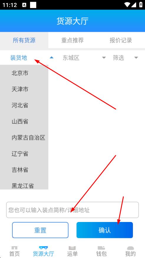 2、在貨源大廳頁(yè)面,點(diǎn)擊裝貨地選項(xiàng),選擇或輸入裝貨地點(diǎn)后,點(diǎn)擊確認(rèn),篩選符合需求的貨源。