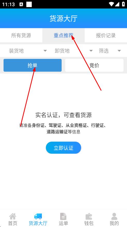 3、點(diǎn)擊重點(diǎn)推薦選項(xiàng)卡,查看重點(diǎn)推薦的貨源信息,找到合適的貨源后點(diǎn)擊“搶單”嘗試獲取該貨源。