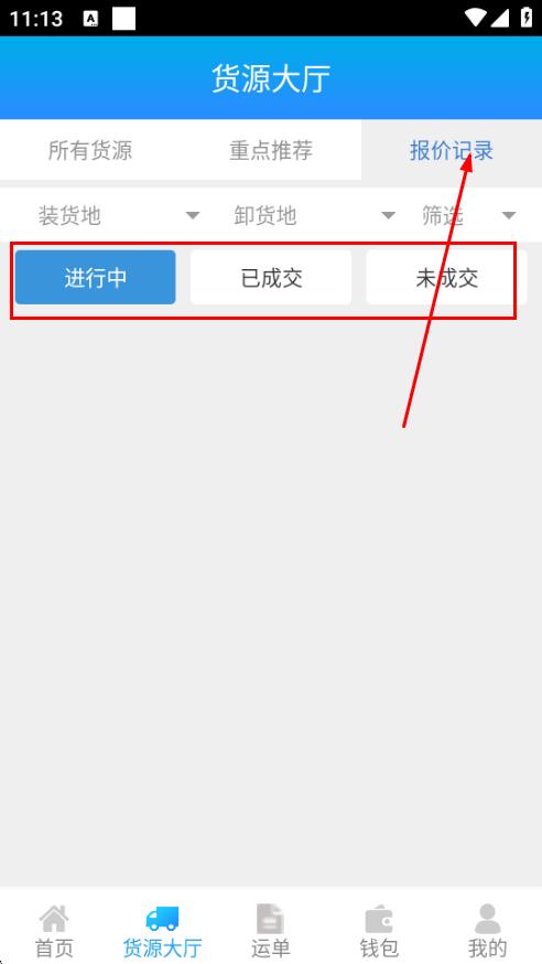 4、點(diǎn)擊報(bào)價(jià)記錄選項(xiàng)卡,可以查看進(jìn)行中、已成交、未成交的報(bào)價(jià)記錄,了解參與搶單的進(jìn)展和情況,以便調(diào)整搶單策略。